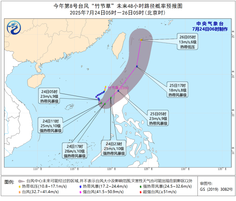 预计,“竹节草”将先以每小时10~15公里的速度向东南方向移动,强度还将有所增强,24日傍晚开始转向东北方向移动,逐渐向菲律宾吕宋岛西北部沿海靠近,24日夜间至25日上午在吕宋岛西北部沿海登陆(23~28米/秒,9~10级,热带风暴级或强热带风暴级),尔后进入巴士海峡并趋向台湾以东洋面,强度逐渐减弱。
