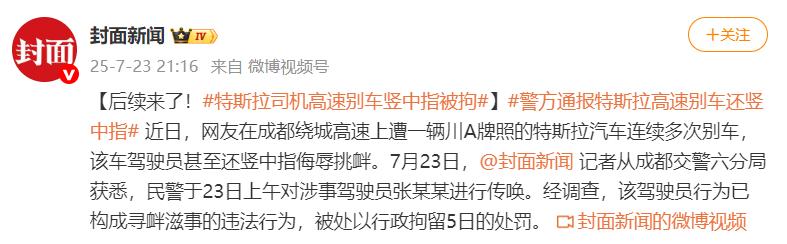 7月23日晚,记者从成都交警六分局获悉,民警于23日上午对涉事驾驶员张某某进行传唤。经调查,该驾驶员行为已构成寻衅滋事的违法行为,被处以行政拘留5日的处罚。