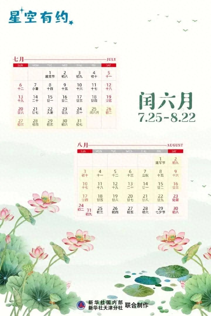 今年7月22日(农历六月二十八),是中气大暑,下一个中气处暑在8月23日(农历七月初一),这当中的7月25日至8月22日的农历月中只有一个节气立秋,没有中气,所以这个农历月就定为闰月。因为上一个月是六月,所以这个闰月就称为“闰六月”,共29天。
