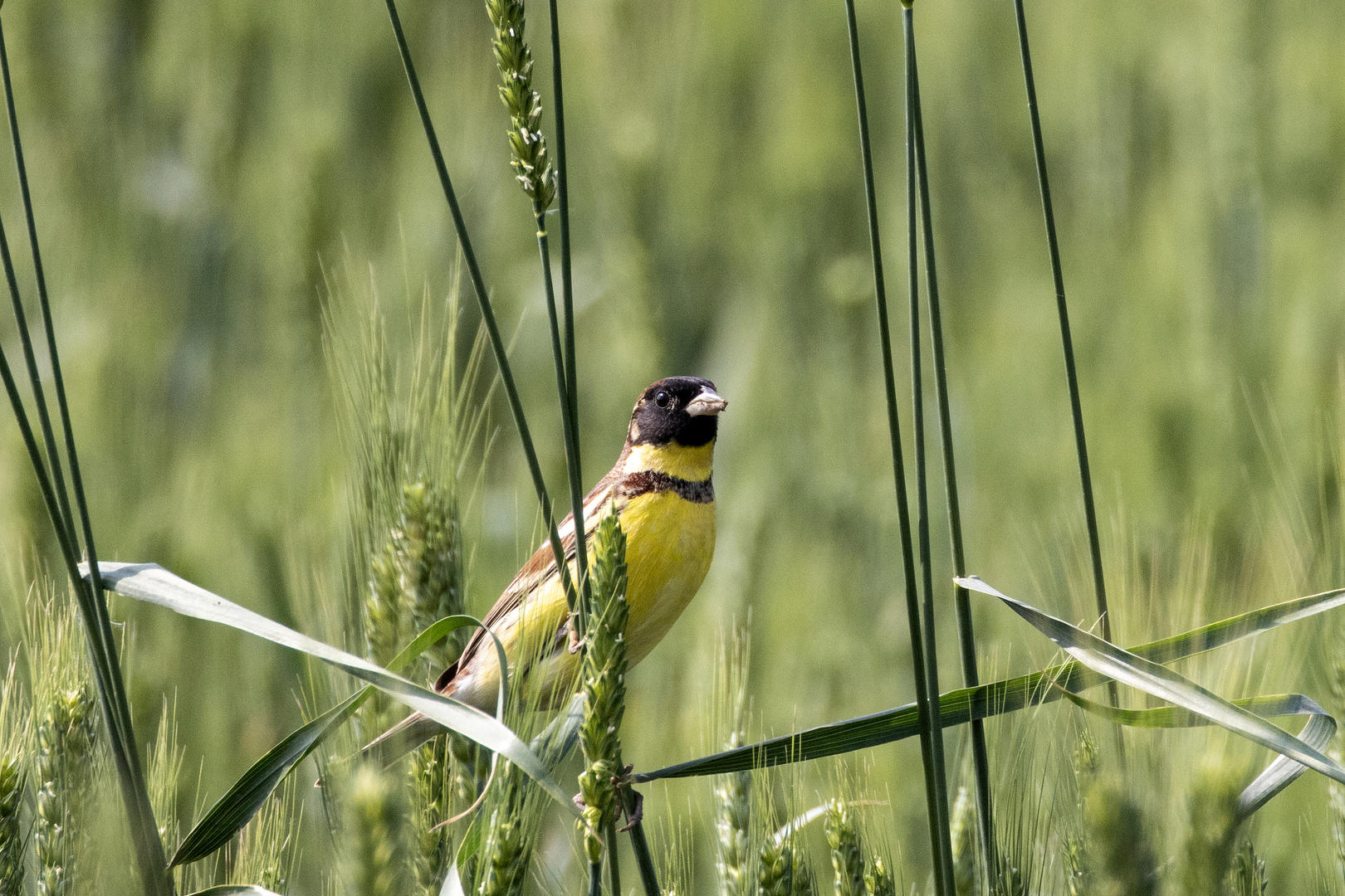5月16日,北京大兴区赢海镇四义庄,国家一级保护动物黄胸鹀在麦田中栖息 图据视觉中国