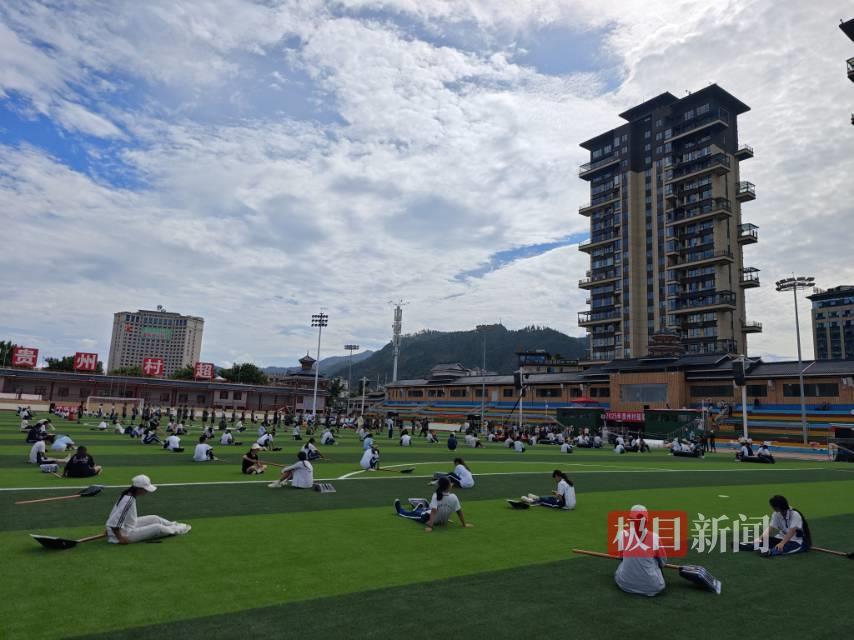 7月24日,极目新闻记者在榕江村超球场看到,学生们正在排练节目,四周工人也正在抓紧施工。原本淤泥堆积的足球场基本已完成重建,铺设好全新的草坪,场边也搭建了全新看台,现场还有不少工人正在为最后的装饰、检票设施等施工。“感恩雄起,村超加油。”村超足球场上挂起了此次赛事的主题标语。