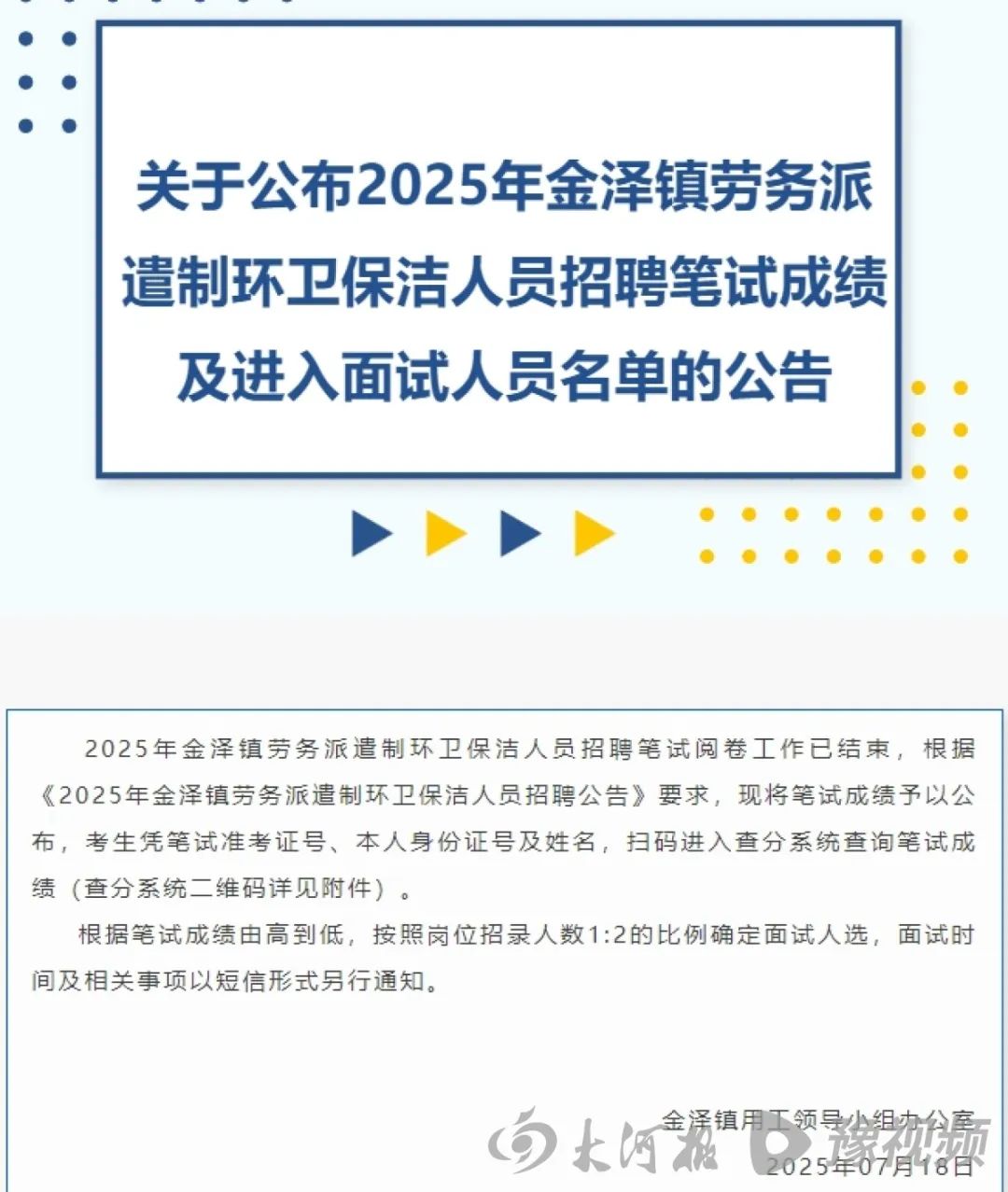 7月18日,上海市金泽镇用工领导小组办公室发布公告,称金泽镇用工领导小组办公室,根据笔试成绩由高到低,按照岗位招录人数1:2的比例确定面试人选,面试时间及相关事项另行通知。
