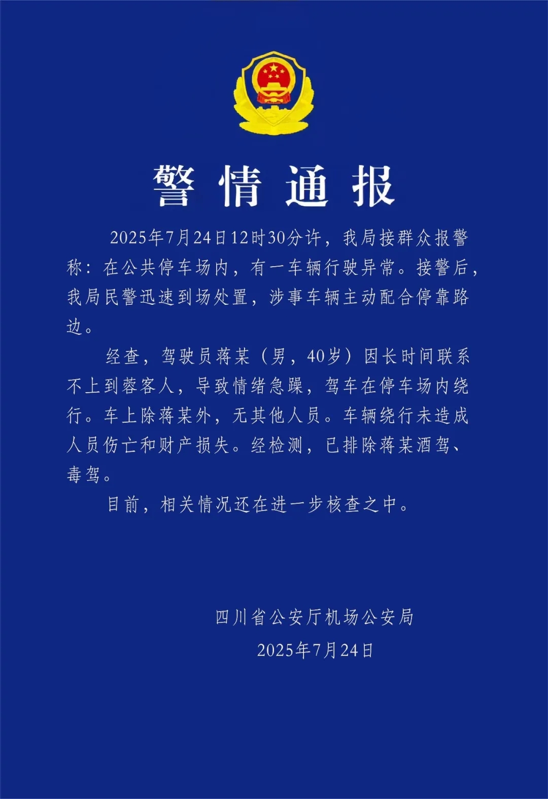 警方通报网约车在停车场绕行:驾驶员贾某(男,40岁)因长时间联系不上客人,导致情绪急躁,已排除酒驾、毒驾