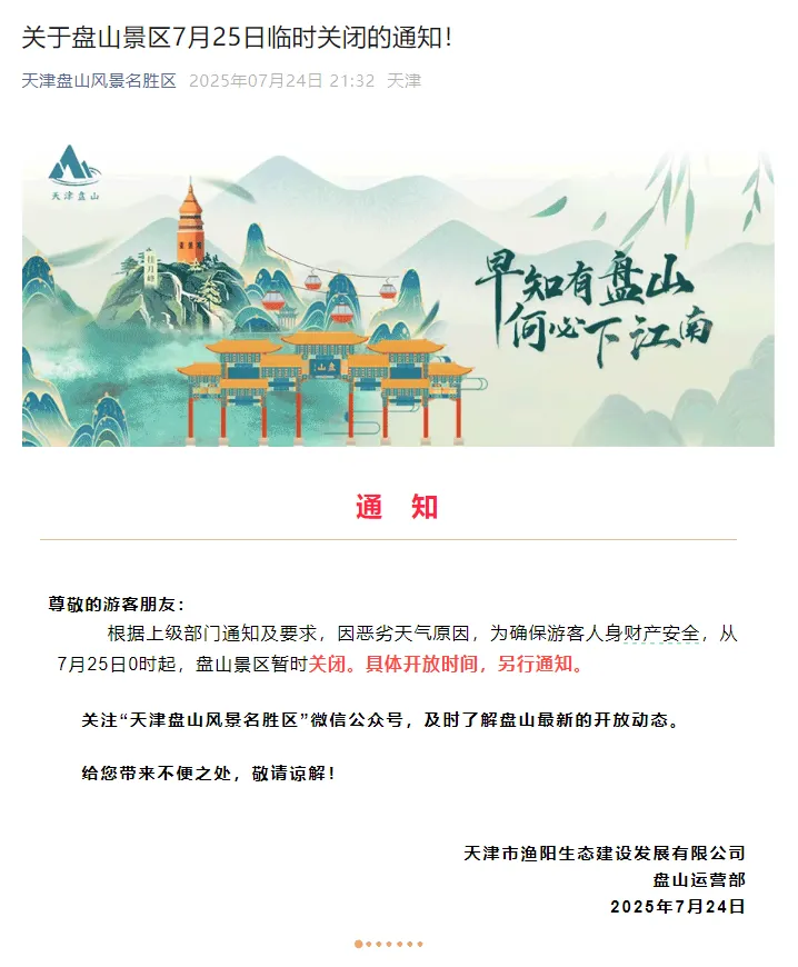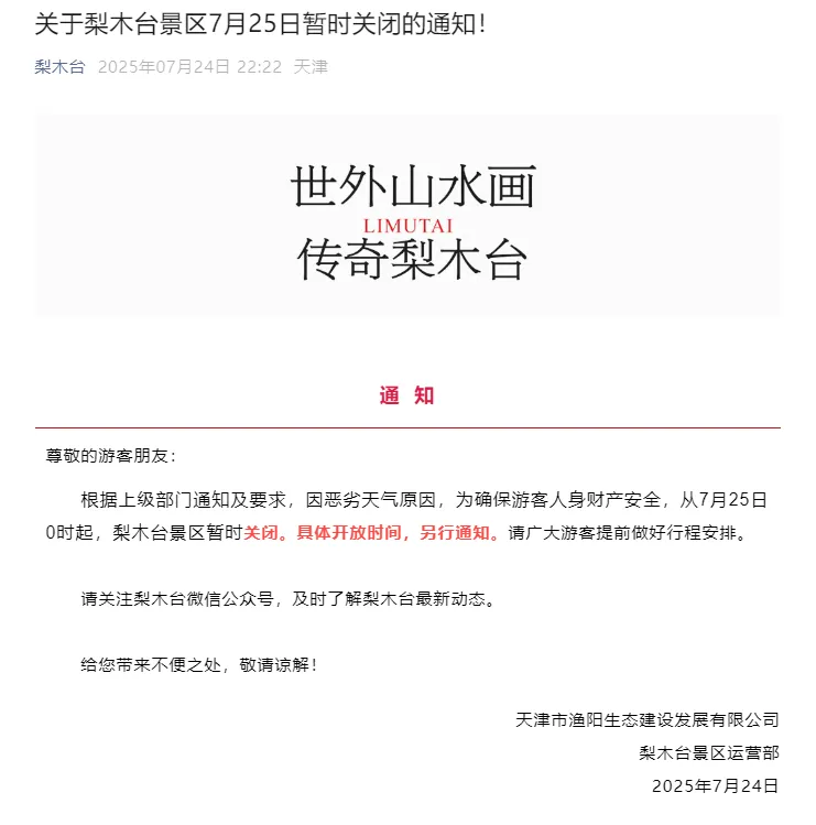相继发布7月25日景区暂时关闭的通知