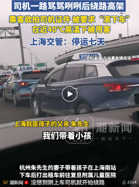 当天,上海发布高温橙色预警,气温达到38℃。杭州朱先生的妻子带着孩子到上海就医。在上海南站打出租车前往复旦附属儿科医院时,司机疑似因距离过近辱骂乘客,并在半路要求乘客下车。