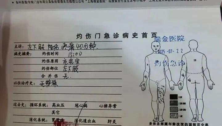 王女士表示,由于朋友左腿Ⅲ度烧伤,医生说要做植皮手术,费用大约为3万-4万元。上海瑞金医院烧伤急诊病例显示:患者灼伤部位为左下肢,灼伤原因为充电宝。