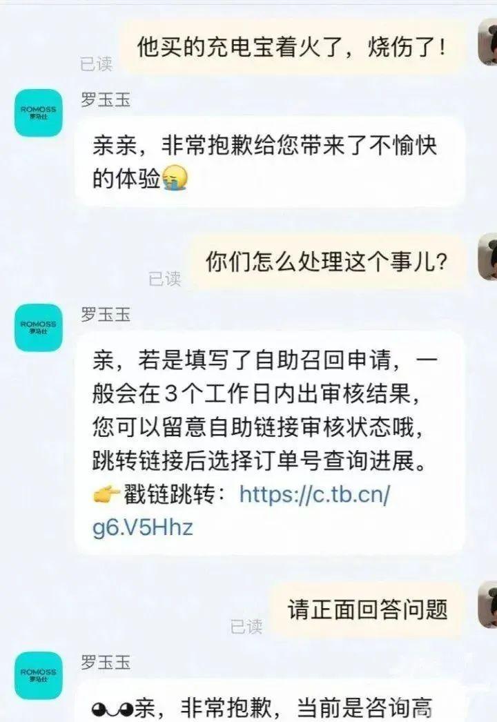 记者再次联系了罗马仕旗舰店的客服,询问产品着火烧伤后,对方怎么应对处理。人工客服就问题答非所问,没有正面回应。