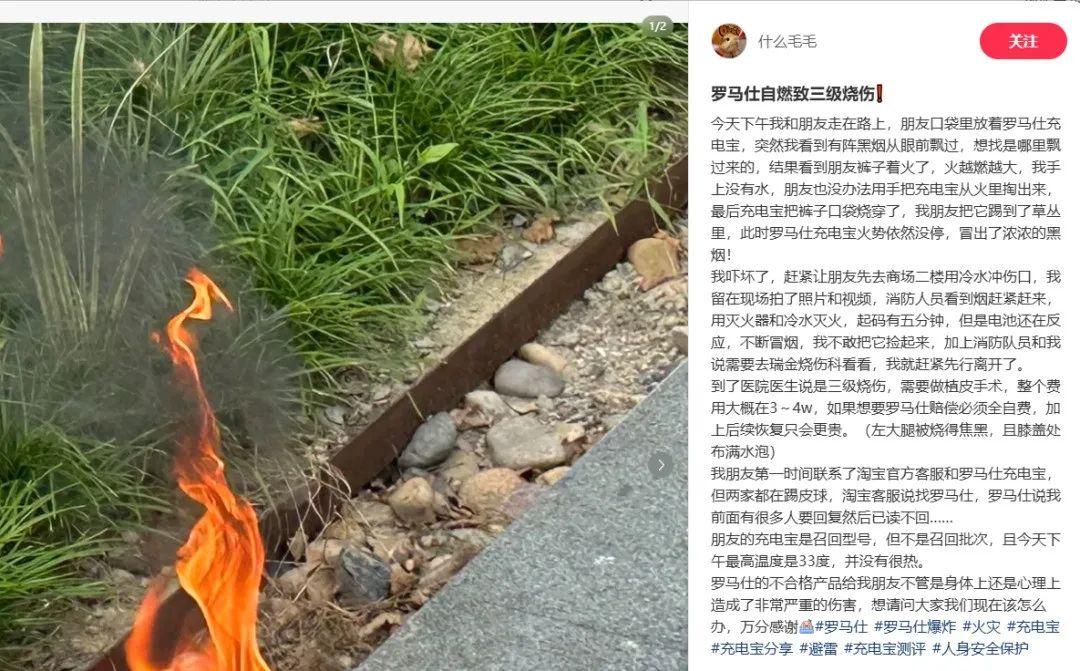 7月23日,上海一小伙裤子口袋里的罗马仕充电宝突然起火,当场被烧伤。经医院诊断为Ⅲ度烧伤,需进行植皮手术,费用将达数万元。其朋友在社交账号上发文求助——