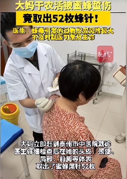 泰州市中医院急诊外科副主任宋宗民给邹大妈检查后,在她的头皮、颈部、肩部、前胸等体表位置取出了52枚蜜蜂尾针。邹大妈看到后也吓了一阵冷汗,再迟点就医,后果不堪设想。
