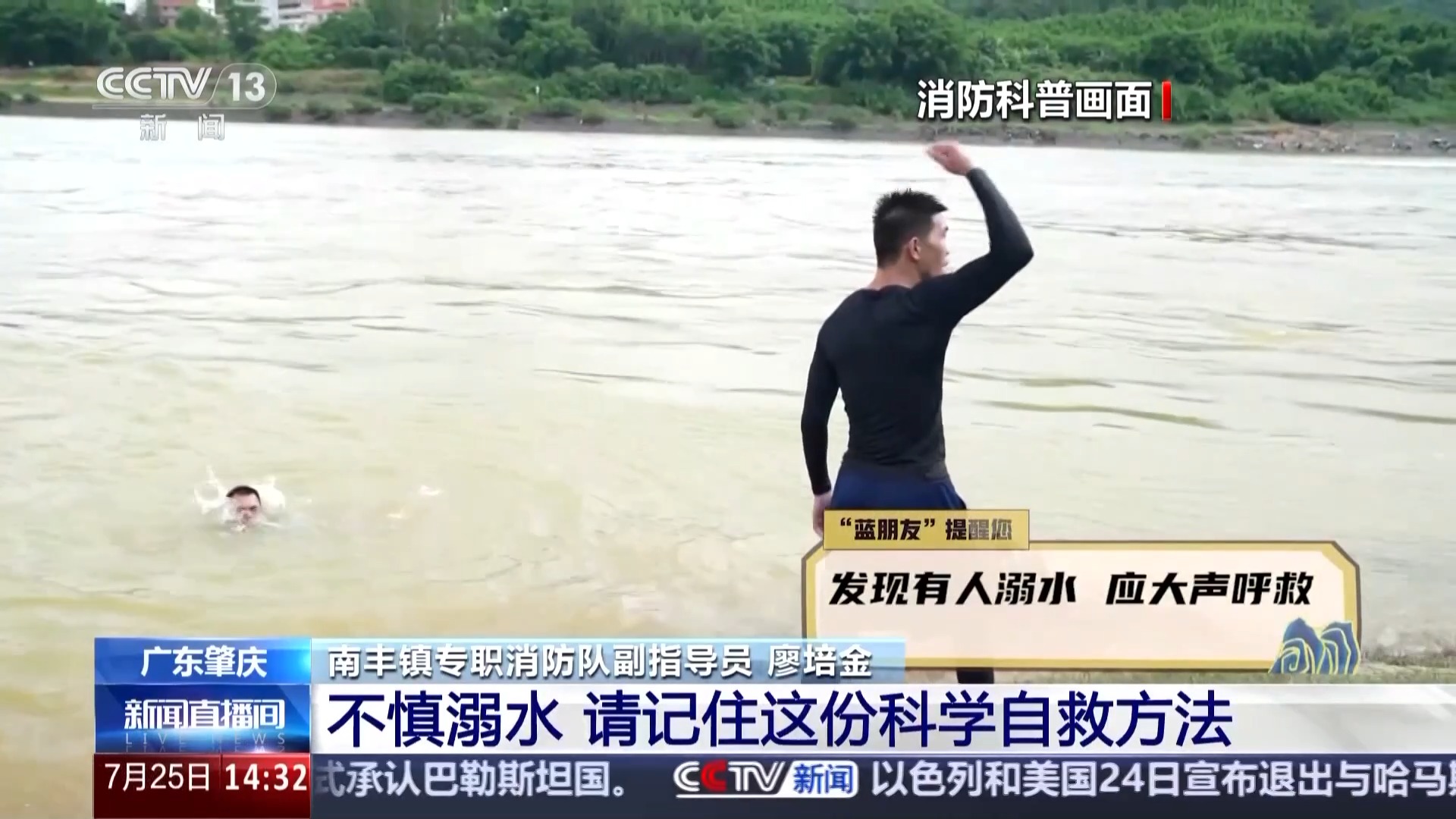 广东肇庆南丰镇专职消防队副指导员 廖培金:如果发现有人溺水,首先要大声呼救,叫更多的人来帮忙。同时可充分利用现场器材,如绳、竿、木板、救生圈等物品施救。需要下水救溺水的人的时候一定要大声告诉他:不要惊慌,有人在救你。救人者应绕到溺水者的背后或潜入水下,从其左腋下绕过胸部然后握其右手以仰游姿势将其拖向岸边。施救者若不熟悉水性或不了解现场水情不应轻易下水,应呼救或报警,未成年人不宜下水救人。