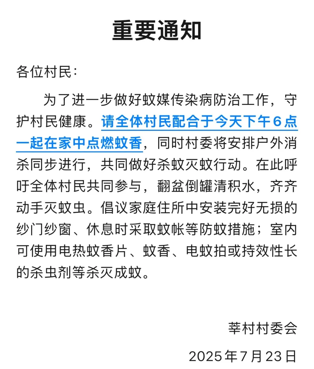近期,佛山市多个区均出现了蚊媒传染病基孔肯雅热,为减少蚊虫孳生隐患,连日来顺德北滘、陈村多村居陆续在网上发出倡议,要求全体村民在下午6点一起在家中点燃蚊香。