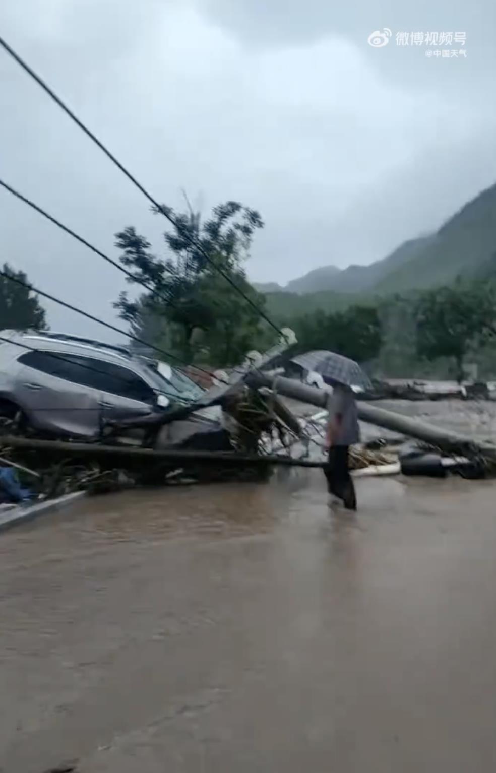 易县受强降雨影响,有电线杆被冲毁(图源:中国天气网)