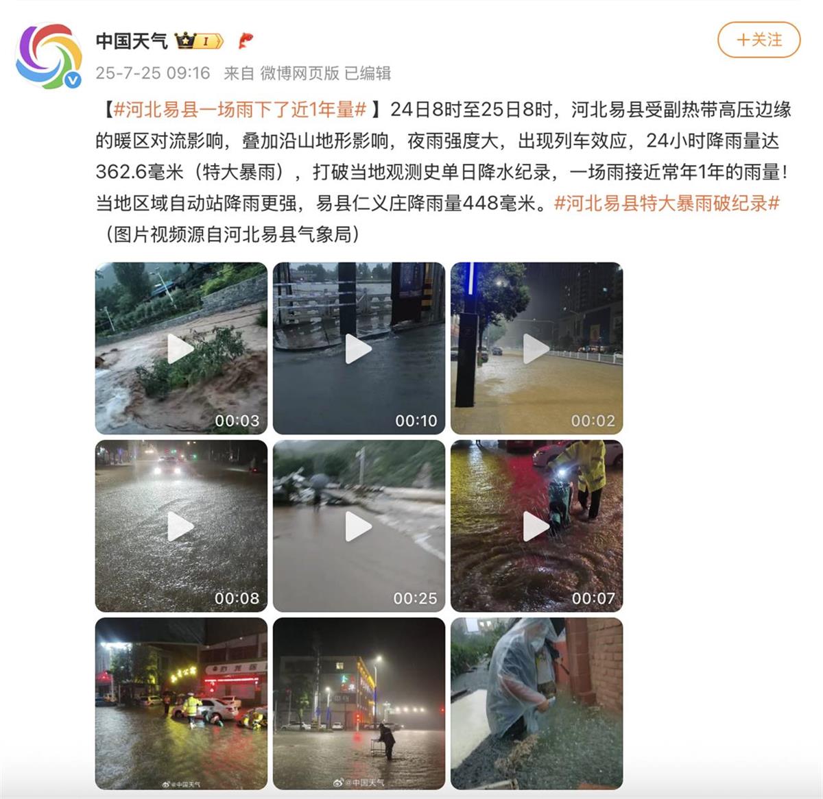 一场雨接近常年1年的雨量!7月24日8时至7月25日8时,河北易县24小时降雨量达362.6毫米(特大暴雨),打破当地观测史单日降水纪录,最大降水量出现在易县仁义庄,降雨量达448毫米。