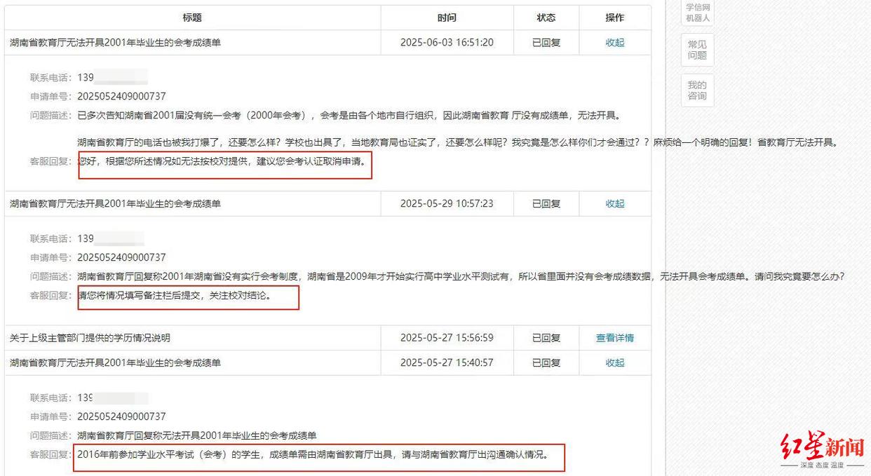 多条5月到6月林女士与学信网的沟通记录显示,林女士多次告知学信网,湖南2001届的高中毕业生没有全省统一的会考,该会考由各地市自行组织,因此湖南省教育厅无法开具成绩单,“湖南省教育厅的电话被我打爆了,学校也出具了(《成绩单》),当地教育局也证实了,还要(我)怎么样呢?”