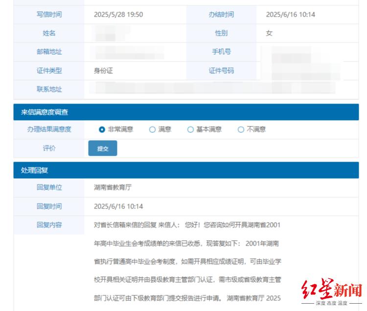 因“问了一圈”都没能解决自己的困惑,5月28日,林女士就其遭遇向湖南省人民政府网“省长信箱”进行投诉。6月13日,湖南省教育厅回复林女士,如需开具相应成绩证明,可由毕业学校开具相关证明,并由县级教育主管部门认证,需市级或省级教育主管部门认证,可由下级教育部门提交报告进行申请。