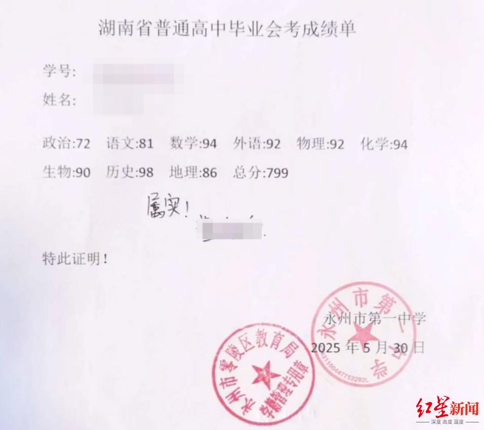 永州市第一中学、永州市零陵区教育局于5月30日联合作出的《湖南省普通高中毕业会考成绩单》显示,林女士的高中会考总分为799分。林女士将这份成绩单作为证明材料向学信网提交,但学信网要求,林女士须提供湖南省教育厅作出的“统一格式”的成绩单,并建议“请与湖南省教育厅沟通确认情况”。