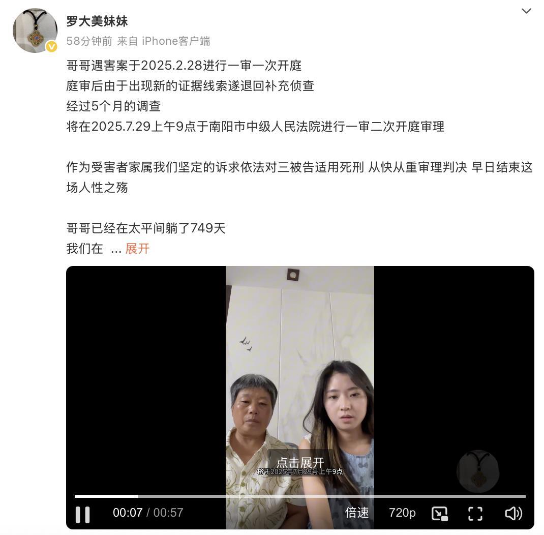 该案于2025年2月28日在河南省南阳市中级人民法院一审开庭,未当庭宣判。7月25日下午,罗大美的妹妹尚女士告诉极目新闻记者,庭审后由于出现新的证据线索遂退回补充侦查,经过5个月的调查,将在7月29日上午于南阳市中级人民法院进行一审二次开庭审理。