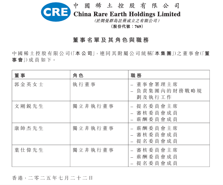 红星资本局注意到,中国稀土最新公布的董事会成员名单里,蒋泉龙已不在列。具体来看,公司的执行董事为郭金英,三位独立非执行董事分别为文刚锐、康帅杰、叶世伟。