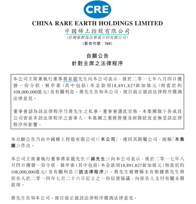 2017年8月8日,中国稀土发布公告称,时任公司主席兼执行董事蒋泉龙向公司表示,自己于2017年8月4日收到了一份令状,被申索款项1889.18万新加坡元(相当于1.08亿港元)。但公司没有公布蒋泉龙被申索本金及利息的原因,仅称此事为蒋泉龙的私事。