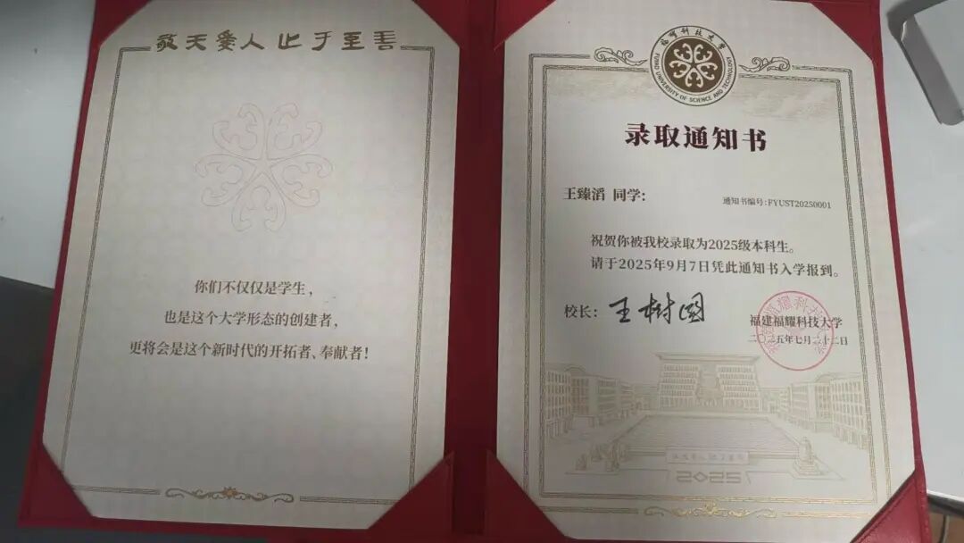 △7月24日,王臻滔收到了福耀科技大学的录取通知书