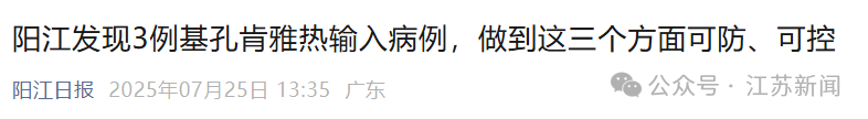 据阳江日报记者从阳江市疾控中心获悉,截至7月24日,阳江市共发现3例基孔肯雅热输入病例,尚未发现本地续发病例,疫情输入风险总体可控。