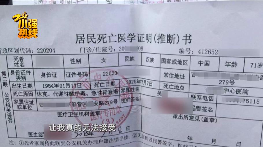 “7月4号回到老家,都一切还好,7月7号早晨9点钟,我妈妈突然病重,送到医院抢救,一直抢救到晚上11点钟,抢救无效去世了,急性肾衰竭。就这个东西,让我真的无法接受,因为我妈妈虽然是肝癌,但是也没有到躺在家里走不动道的时候。”吴先生回忆。