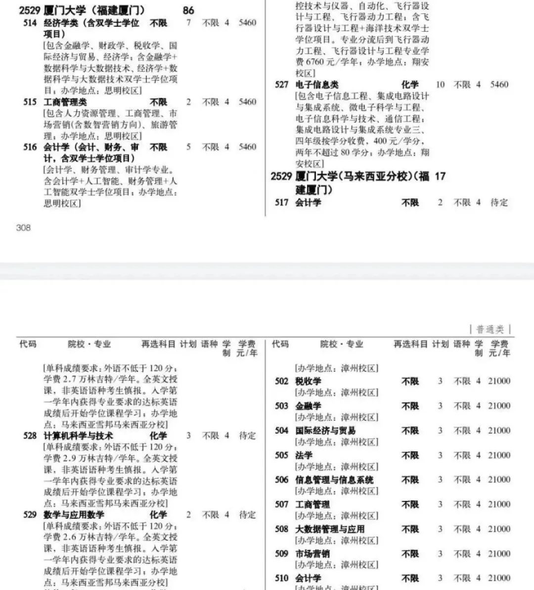 该目录显示:厦门大学计算机科学与技术专业编号为528,单科成绩要求外语不低于120分;学费2.9万林吉特(约折合人民币49000元)/学年。全英文授课,非英语语种考生慎报。入学第一学年内获得专业要求的达标英语成绩后开始学位课程学习;办学地点:马来西亚雪邦马来西亚分校。