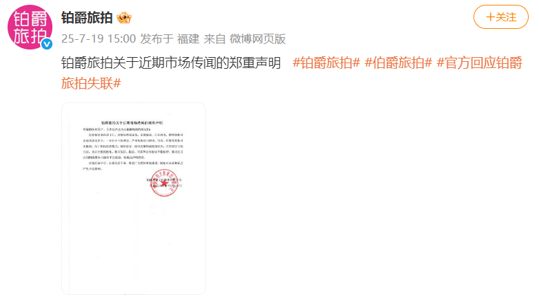 7月19日,铂爵旅拍发布关于近期市场传闻的郑重声明,其中提到:为了优化经营模式,减负前行,我司决策缩减旅拍业务,关停部分亏损门店,并进行组织优化。我司旅拍、跟拍、写真等业务板块平稳运营。