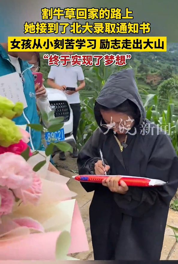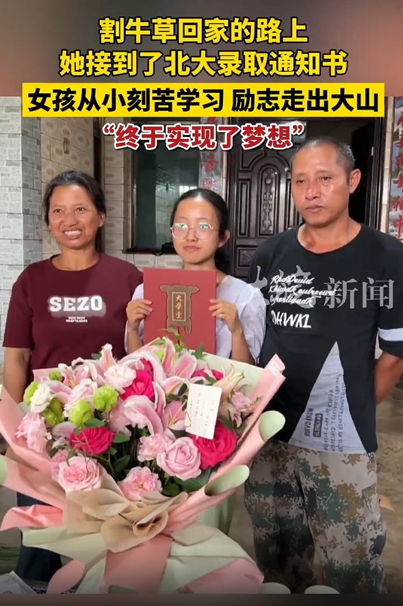 7月25日,云南临沧。高考学子张镜在割完牛草回家的路上收到了北大录取通知书。