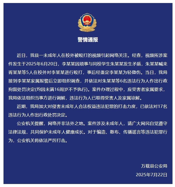 7月22日,江西万载县公安局发布警情通报:近日,万载县一未成年人在校外被殴打的视频引起网络关注。经查,视频所涉案件发生于2025年6月20日,李某某因琐事与同校学生朱某某发生矛盾,朱某某喊来胥某某等5人在校外对李某某进行殴打,事后经鉴定李某某为轻微伤。当日,万载县公安局接到李某某家属报警后立即组织调查,并依法对朱某某等6名违法行为人作出行政拘留处罚决定(均因未满16周岁不予执行)。案件办理过程中,应受害者家属要求,该局依法组织当事方进行调解,违法行为人已取得受害人及家属谅解。