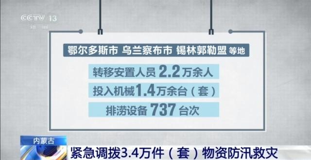 鄂尔多斯市、乌兰察布市、锡林郭勒盟等地转移安置人员2.2万余人,投入机械1.4万余台(套),排涝设备737台次,救援物资8287套,维修工程设施270处,全力开展防汛救灾工作。