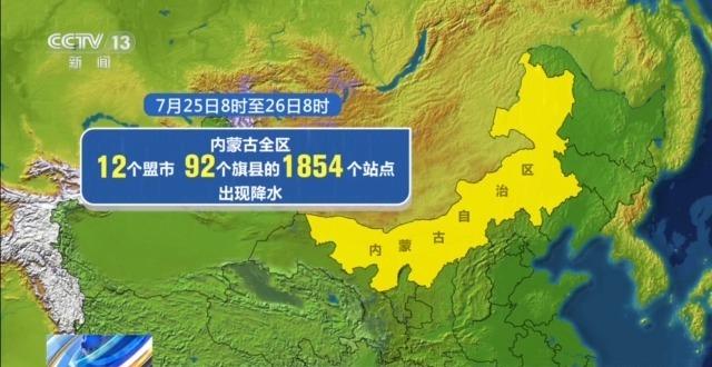 雨情信息显示:7月25日8时至26日8时,内蒙古全区12个盟市、92个旗县的1854个站点出现降水,其中锡林郭勒盟、乌兰察布市、呼和浩特市、通辽市等地出现强降水。