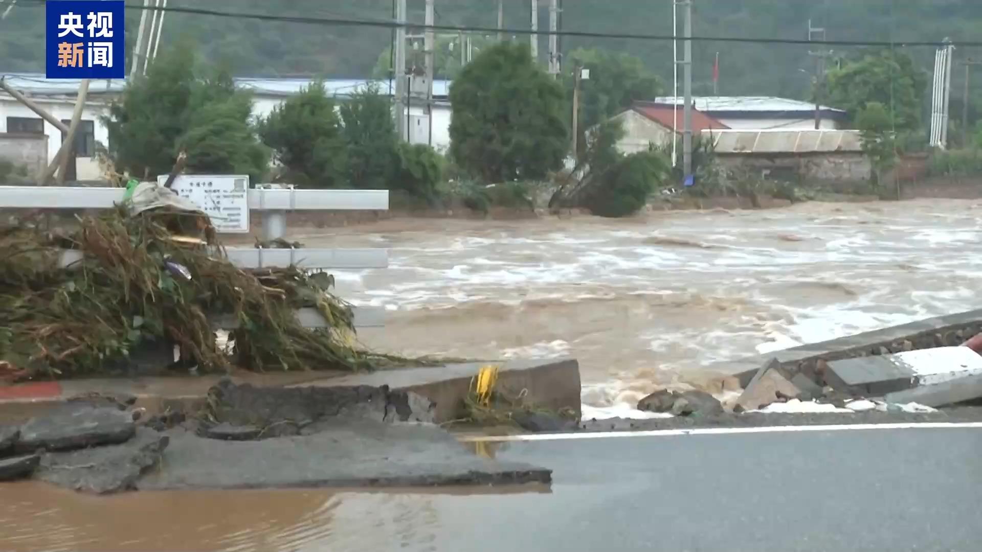 在北京市密云区不老屯镇半城子村,水流非常汹涌,但相比昨晚已经“温柔”了许多。通行的主干道上树木倒伏严重。水淹路面导致水下路面可能存在水毁以及周边山体存在二次滑坡的风险。