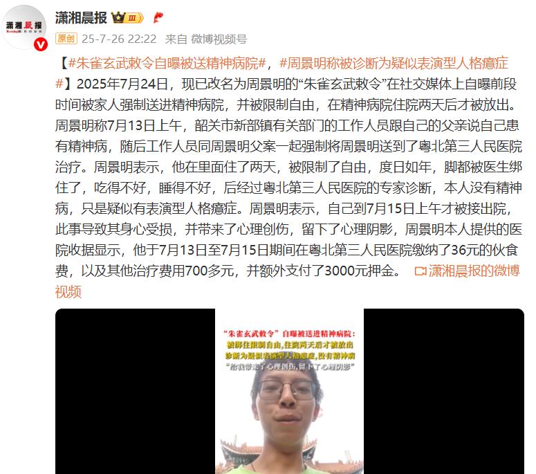 2025年7月24日,现已改名为周景明的“朱雀玄武敕令”在社交媒体上自曝前段时间被家人强制送进精神病院,并被限制自由,在精神病院住院两天后才被放出。