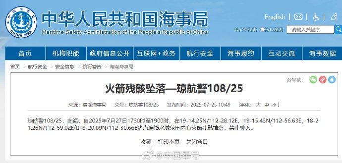 据中国海事局网站消息,清澜海事局发布航行警告,7月27日17时30分至19时,南海部分水域有火箭残骸掉落,禁止驶入。