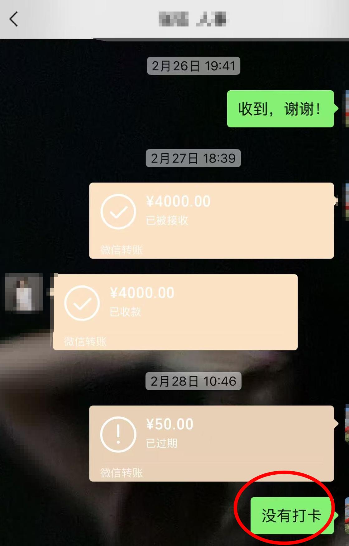 韩总还给李女士提了罚款4000元的要求。李女士提供的她与人事张女士的聊天记录显示,在2月27日下午18时39分,她向张女士转账了4000元。“后来韩总说不能微信转账,我又取了现金交给人事。”而在2月28日,李女士还因为没有打卡,按规定罚款50元,李女士在和人事的聊天记录中,也有50元的转账记录。