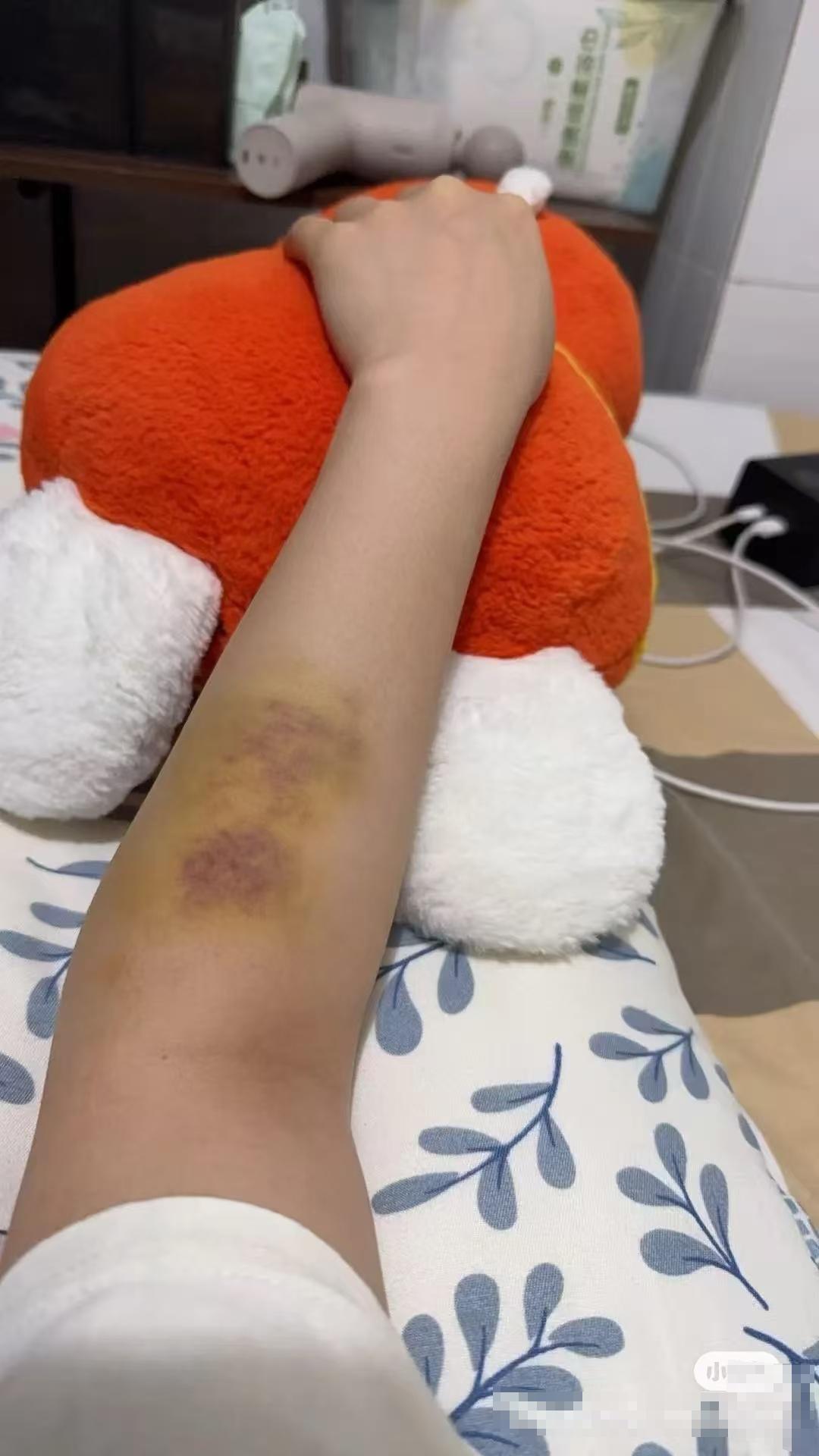 “然后他就开始打我,左手搂着我的脖子,右手打了我的嘴巴和额头,打完之后我眼前就黑了,手机也飞出去了,想站发现站不起来了,腰钻心地疼。”刘女士回忆称,当时自己在厕所里喊,但没有人给她开门,对方多人围着她,要抢她的手机,要删视频,因为自己全程有录像,刘女士趁着他们抢手机的时间爬出厕所了。出来后,刘女士称自己受了伤,要求对方打120急救电话,但对方说她是装出来的,拒绝联系120急救电话。