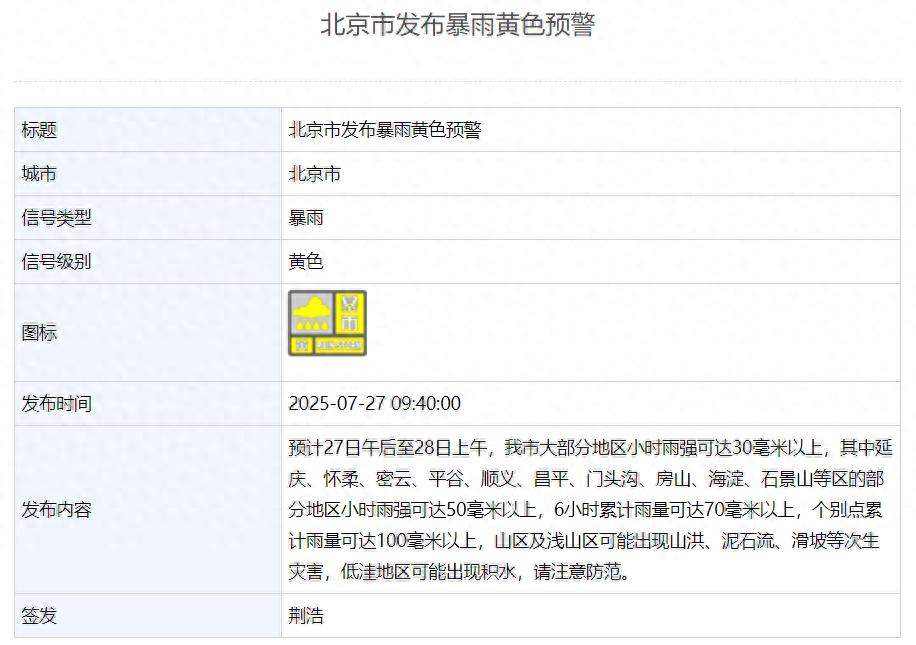 7月27日,北京发布暴雨黄色预警:预计27日午后至28日上午,我市大部分地区小时雨强可达30毫米以上,其中延庆、怀柔、密云、平谷、顺义、昌平、门头沟、房山、海淀、石景山等区的部分地区小时雨强可达50毫米以上,6小时累计雨量可达70毫米以上,个别点累计雨量可达100毫米以上,山区及浅山区可能出现山洪、泥石流、滑坡等次生灾害,低洼地区可能出现积水,请注意防范。