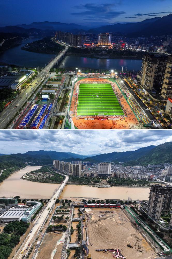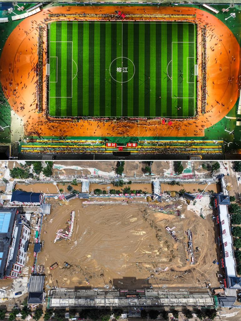 上图为7月25日在贵州榕江拍摄的灾后重建后的“村超”球场(无人机照片);下图为6月25日在贵州榕江拍摄的遭受洪水袭击的“村超”球场(无人机照片)。新华社记者 杨文斌 摄
