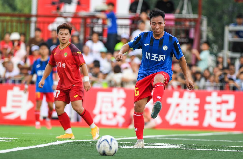 7月26日,扒王村足球队球员吴化勇(右)在与东门村足球队的比赛中传球。新华社记者 杨文斌 摄