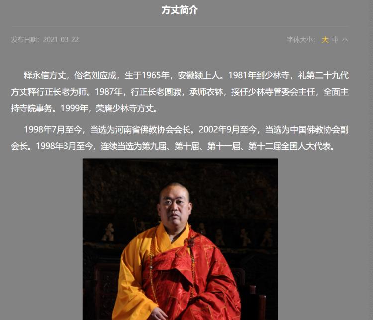 据少林寺官方网站介绍,释永信方丈,俗名刘应成,生于1965年,安徽颍上人。1981年到少林寺,礼第二十九代方丈释行正长老为师。1987年,行正长老圆寂,承师衣钵,接任少林寺管委会主任,全面主持寺院事务。1999年,荣膺少林寺方丈。