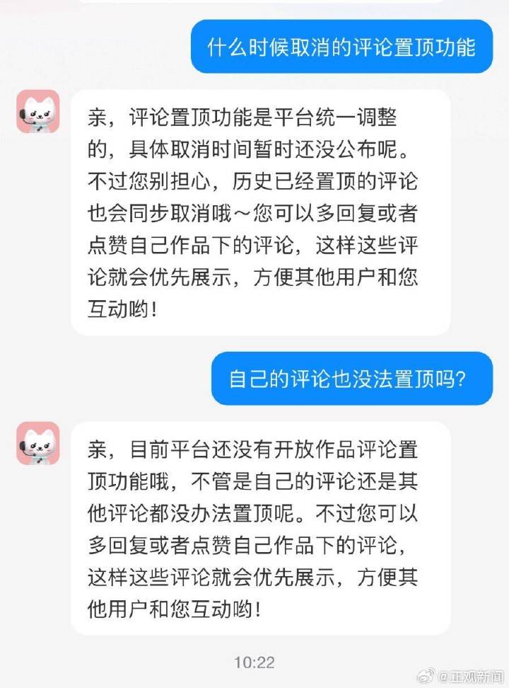 对此,记者也联系到抖音官方。对方确认该消息属实,并表示这是平台的统一调整。不过,抖音官方暂未公布该功能具体的取消时间。值得注意的是,历史已经置顶的评论也会同步取消,创作者只有通过多点赞、多回复自己作品下的评论,方会被优先展示。