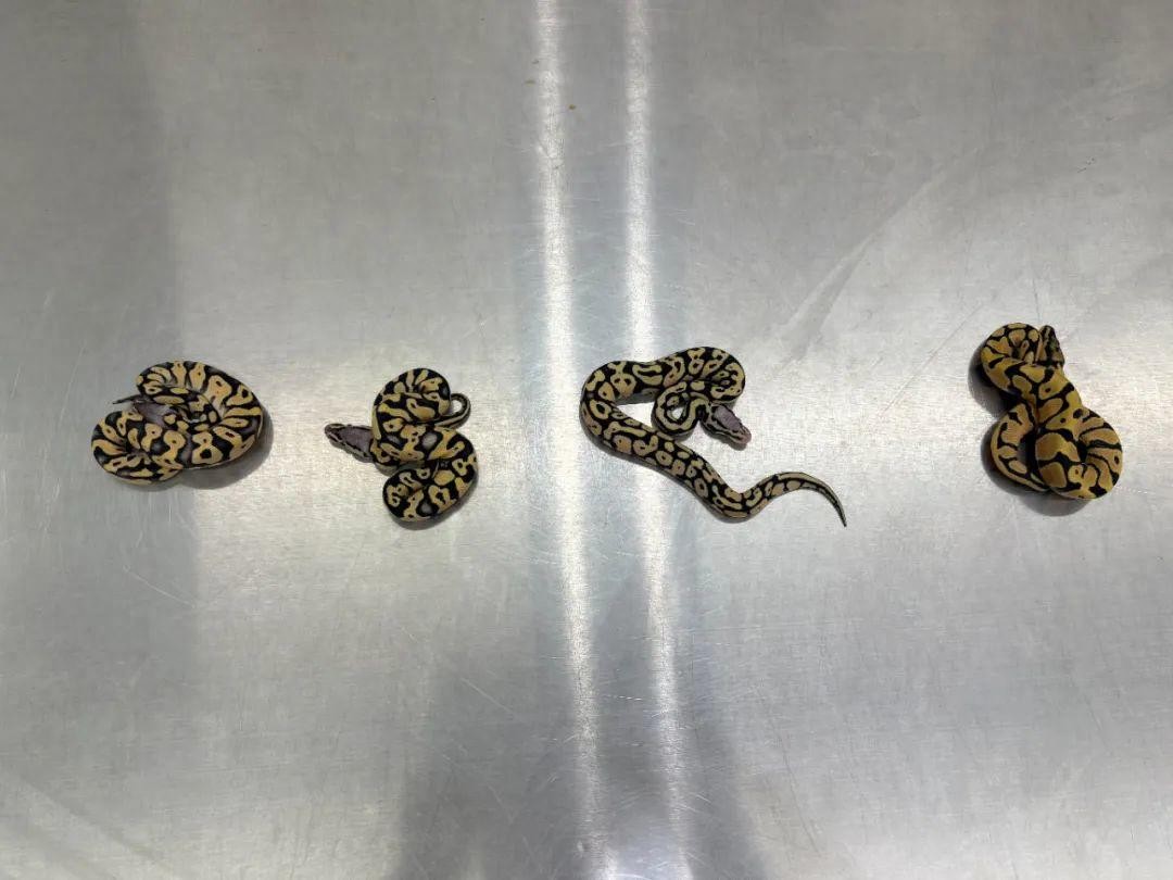 7月14日,皇岗海关在福田口岸旅检进境渠道查获1名旅客人身绑藏濒危球蟒4条。