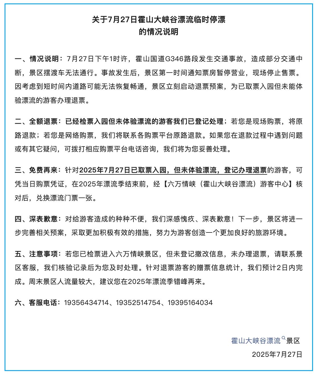 一、情况说明:7月27日下午1时许,霍山国道G346路段发生交通事故,造成部分交通中断,景区摆渡车无法通行。事故发生后,景区第一时间通知票房暂停营业,现场停止售票。因考虑到短时间内道路可能无法恢复畅通,景区立刻启动退票预案,为已取票入园但未能体验漂流的游客办理退票。