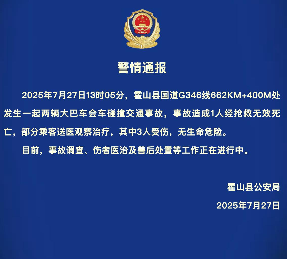 2025年7月27日13时05分,霍山县国道G346线662KM+400M处发生一起两辆大巴车会车碰撞交通事故,事故造成1人经抢救无效死亡,部分乘客送医观察治疗,其中3人受伤,无生命危险。