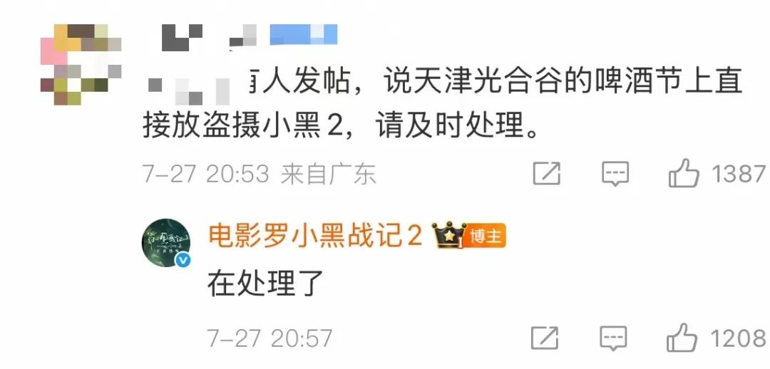 记者同时发现,7月27日晚20点57分,有网友在电影《罗小黑战记2》的官方微博下反映该情况,电影《罗小黑战记2》官博回应:在处理了。