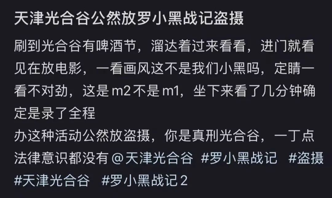 7月27日晚,有网友发帖称在天津光合谷旅游度假区,景区播放影院正热映的电影《罗小黑战记2》。根据网友所发图片,在空旷的广场上,有一幕布正播放《罗小黑战记2》,同时现场有多个观众。网友在帖子中表示,“办这种活动公然放盗摄,你是真刑光合谷,一丁点法律意识都没有。”