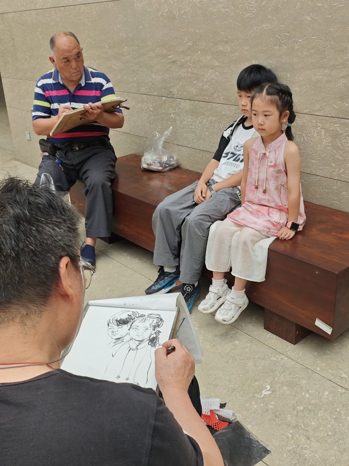 二三十分钟,一个人物就画好了。 “小姑娘,你过来坐。”一个八九岁的小姑娘现场被邀请当模特,小姑娘大大方方,两手并膝端坐。