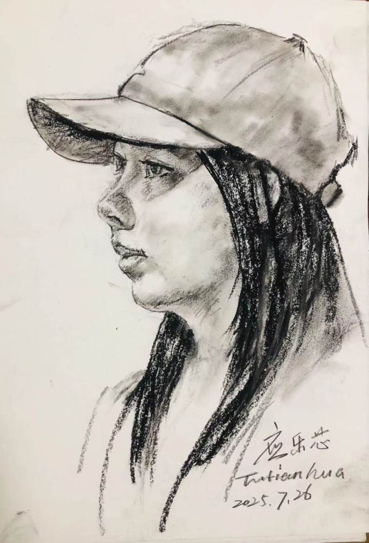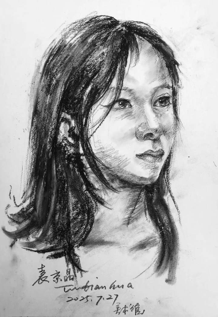 一位江西抚州游客现场被邀请当模特,画家罗驰现场为她画素描肖像。