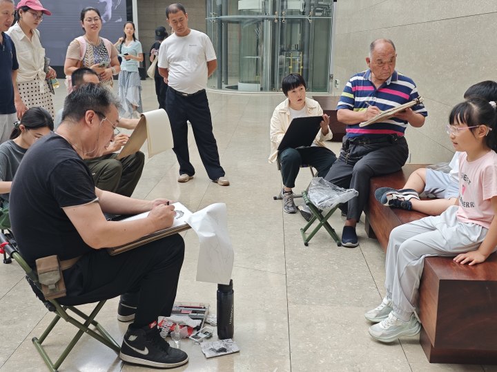 昨天上午,浙江美术馆一楼大厅靠墙一隅,一个姑娘坐着当模特,自然松弛,旁边10多个人坐着小马扎,人手一个画板,神情专注。周围,不少游客驻足观望拍照。